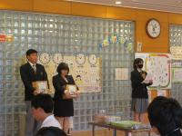 翠星高等学校の代表生徒と先生、弘済会の方が来校され、「菊環羊羹」贈呈式が行われました。能登半島地震で実際に被災した翠星高校生がその経験から「栄養と水分が手軽に摂れる美味しい非常食を作ろう」と決意し、つくられた備蓄用の羊羹。高校生がその思いを真剣に語ってくれました。