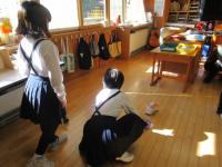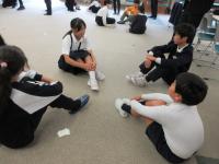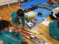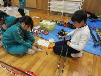 3・4・5・6年 「クロスカントリースキー道具の準備」 3学期に行うスキー授業のために、靴のサイズ合わせをしたりスキー板の手入れをしたりしています。初めて行う3年生には先輩たちがやさしく教えています。