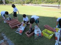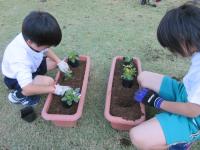「スミレの花苗植え」 1年生がプランターに花を植えました。よく咲くスミレなので来年の春まで花を楽しむことができます。