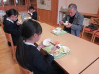 「米作り体験 感謝の会」 5・6年生が田植えや稲刈りの体験をした田んぼのお世話をしてくださった方をお招きして、今年収穫したお米「ひゃくまん穀」を給食でいただきました。新米ならではのもっちりしたおいしさは最高です。