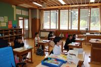 5年 外国語 合宿の様子を英語で伝え合っています。