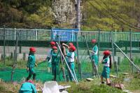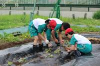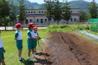〈小学校〉「福島ひまわり里親プロジェクト」 発芽したひまわりを畑の横の花壇に移植して、残りの種もまきました。
