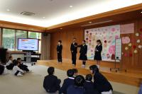 「令和6年1月1日、能登半島に大きな地震がありました。わたしたちが住む白山市も家が大きく揺れました。とても怖かったことを今でも覚えています。被害の大きかった輪島市の小中学生がその後、白嶺小中学校に避難してきました。3月までの2ヶ月間、一緒にスキーをしたり勉強をしたりしました。輪島市の人たちは、今は地元に戻って生活していますが、まだまだ元の生活には戻れていないようです。今、わたしたちにできることを考えました。今回わたしたちが歌う曲は『花は咲く』です。『花は咲く』という歌は東日本大震災の復興ソングとして作られた歌です。この歌を一緒に学校生活を過ごした輪島市の小中学生に届けようと話し合いました。そこで被災した人たちに笑顔を届けられるような歌声を届けます。」(児童による曲紹介より)