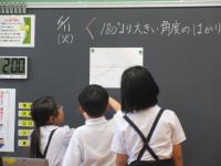 4年 算数 180度より大きい角の大きさの求め方を考えています。研究授業のため小中学校の先生方が参観しています。