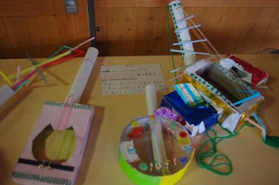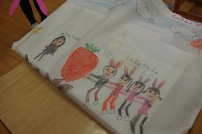 図工 1年間を描いたバッグが完成しています。お面をかぶってバッグを持つ写真をホームページに載せてほしいと1年生からリクエストがありました。