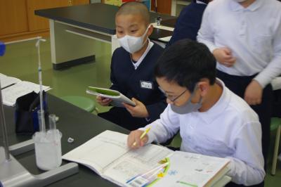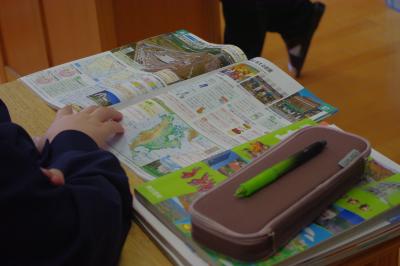 国語 学校の自慢をペアで発表する準備をしています。小中合同の白嶺祭や、皆で食べるランチルームのことなどが挙げられています。