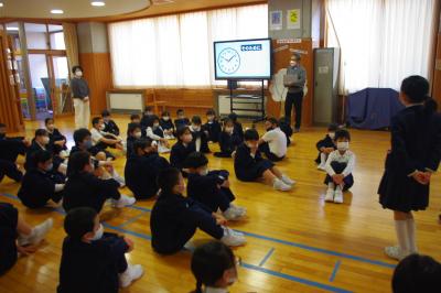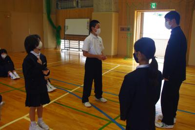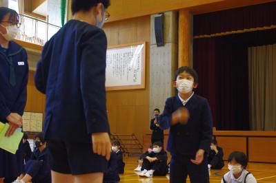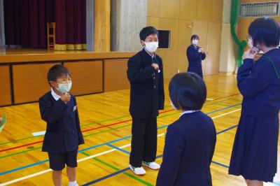 1年生を迎える会に校長先生を招待しています。お辞儀をしたり、整列をしたり、TPOに合わせた所作で、6年生らしい振る舞いです。