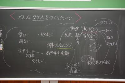 始業式で校長先生から大切にしてほしいと言われたことについて確認しています。挨拶や時間を守ることなど