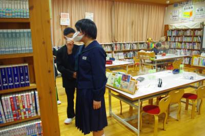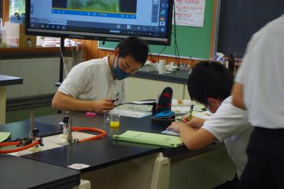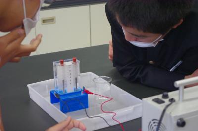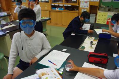 理科 ヨウ素液にデンプンが反応していることを確かめています。薬品を使うためゴーグルをつけています。
