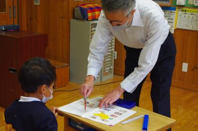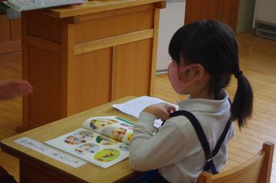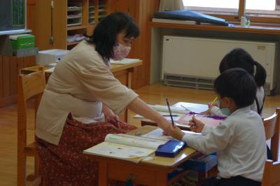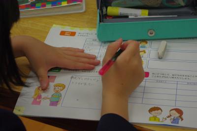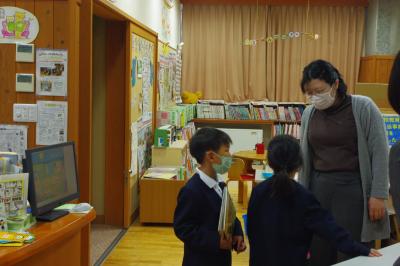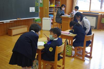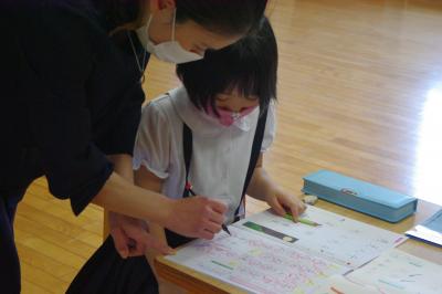 連絡帳の書き方について、2年生が1年生に教えてあげています。