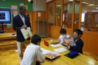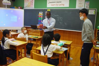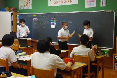 英語 How many  ~s  do  you  have?  を使って数を尋ねる練習をしています。いしかわ師範塾の指導主事の先生から助言をもらいます。他の先生も参観し、授業づくりについて勉強しています。