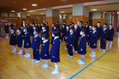 白嶺っ子集会 今月の歌を歌っています。元気な声が響いています。
