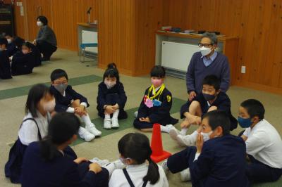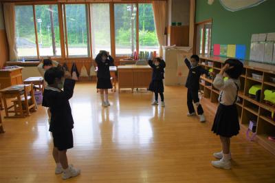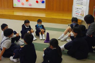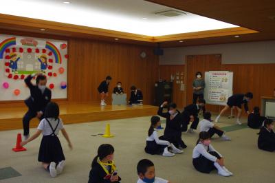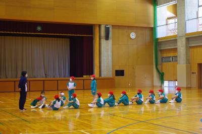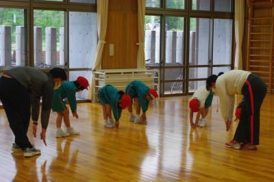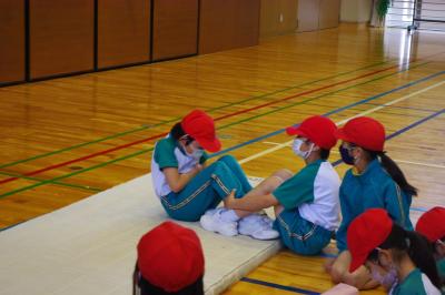 体育 並び方や回れ右を練習しています。準備運動も丁寧に行っています。