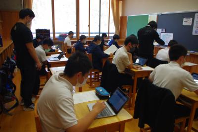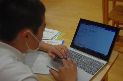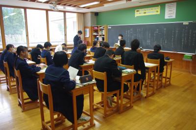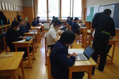 総合的な学習の時間 3年生も課題設定をしています。3年生のテーマは地域活性化の提言です。市の廃線跡地を活用するために、他市の有効活用を検索したり、白山市の市役所ホームページで探求課題のヒントを探したりしている人もいます。