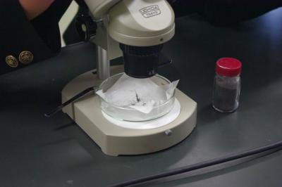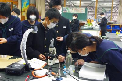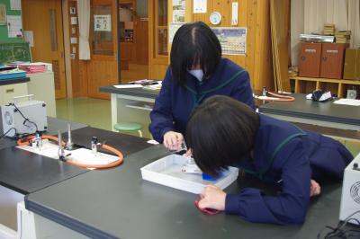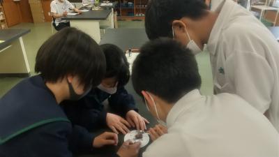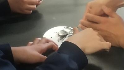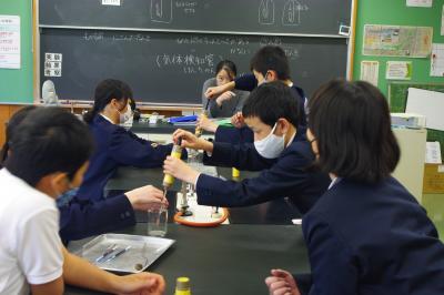 理科 酸化銅に活性炭を混ぜて加熱し、銅に戻す実験を行っています。