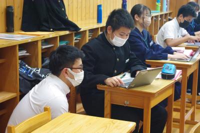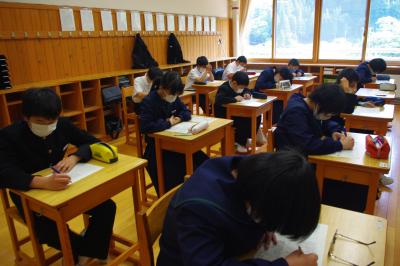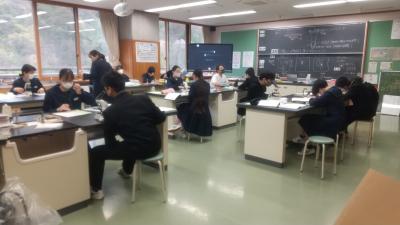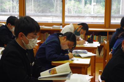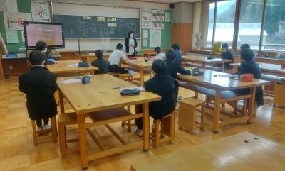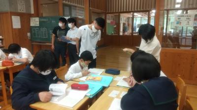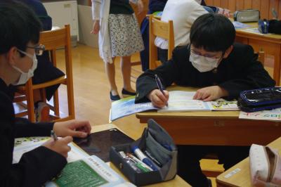 総合的な学習の時間 2年生も個人の探求課題を考えています。2年生は働くことをテーマに探求します。地域の漁協の存在価値についてや、ジビエを扱う職業について調べたいとの記述が見られます。