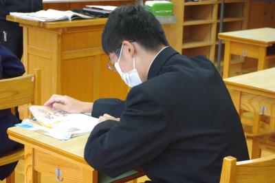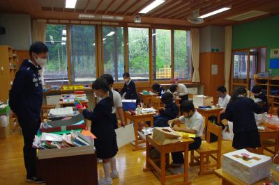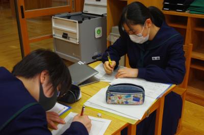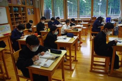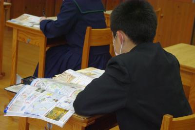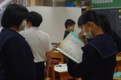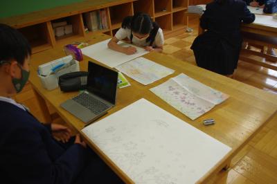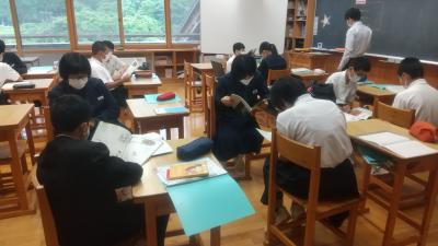 小学校での学びを振り返りながら、探求課題を設定するために、関連する本から、これまでの学びや興味を振り返っています。皆、真剣に考えています。
