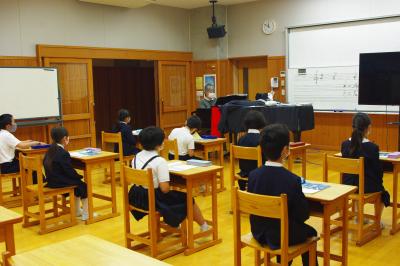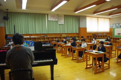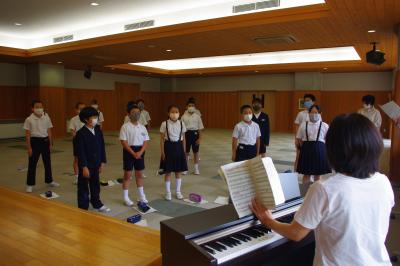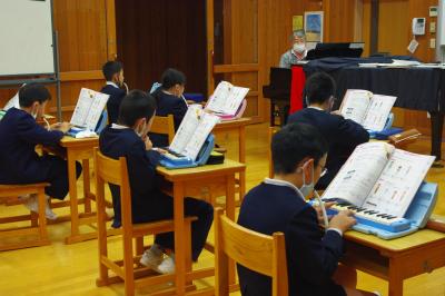 音楽祭に向けて、高学年が低学年に楽譜の見方を教えたり、パートで練習したりしています。
