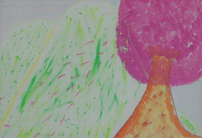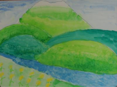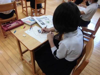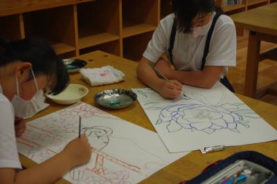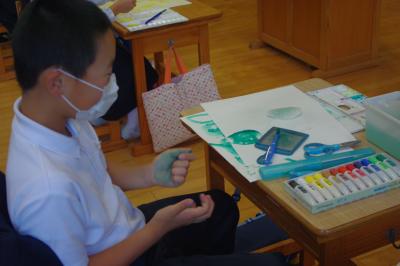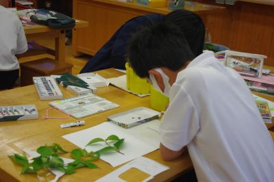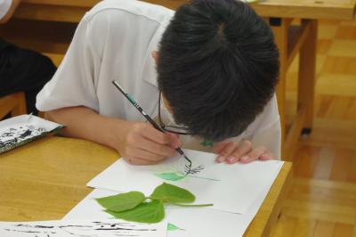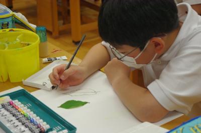 美術 学校周辺にある葉っぱを選んで、それをよく見て描きます。葉っぱ全体の色は水彩絵の具で濃淡をつけて塗り、葉脈はアクリル絵の具ではっきり描きます。