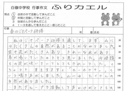 総合的な学習の時間 地域で働く人にインタビューするため、訪問しています。1回目は一里野高原ホテルろあんの料理長と、白山を中心に活動する写真家の方にインタビューをしています。地域の職業を調べることで、自分の将来の夢や希望・生き方を、同世代に伝えたり、白嶺祭で発表したりする予定です。ろあんでは、山ろくまで来てもらうための工夫を、写真家の方には写真家になったきっかけや山ろくで生きる覚悟を聞いています。