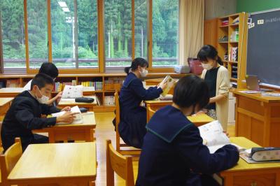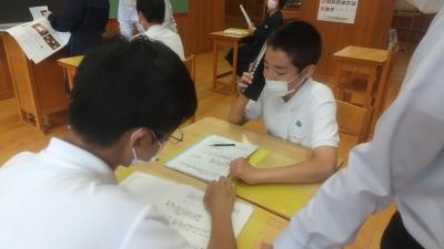 国語 自分がまとめた要約文を伝え合い、内容の精度を確認しています。
