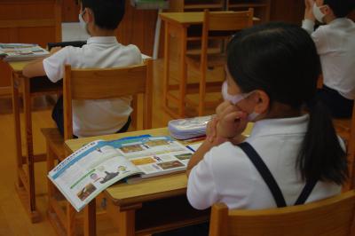 社会 住みよい暮らしを作ることについて、教科書の絵からゴミ収集や下水処理などの公共サービスについて知っていることを発表しています。