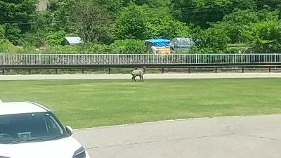 カモシカが学校玄関前に出現。ここまで近くに来ることは珍しいです。