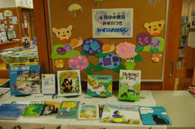 図書館前の特設コーナーは6月の水無月にちなんで、水に関する本を集めています。