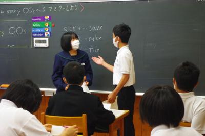 英語 How many ~s do you have? を使って、ペアで会話を練習・披露しています。