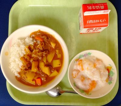 今日の給食はお豆腐ピザ、ニンジングラッセ、クリームシチュー、ご飯(少なめ)でした。