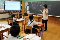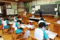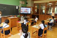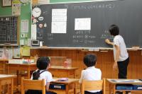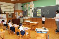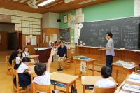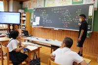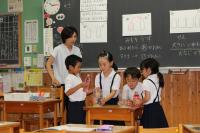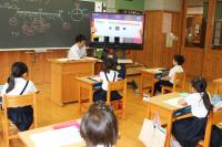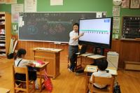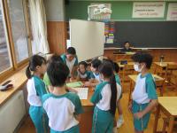 1年 算数「どちらがおおい」 2つの入れ物に入る水のかさを比べる方法を考えています。研究授業として行われたので校内の先生方も参観しました。1年生は自分の考えを友達に説明したり、ノートにふり返りを書いたり、最後まで一生懸命取り組んでいました。