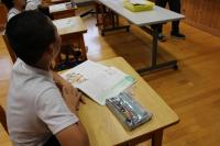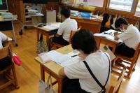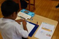 5年 書写 硬筆の練習。手本を見ながら、よい姿勢でていねいに書いています。