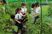 1年 生活科 畑の野菜を収穫しました。大きなキュウリがとれました。ミントの葉もよい香りでした。