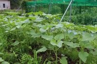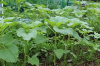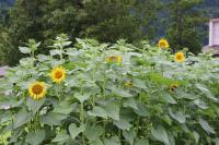 ひまわりも草たけがずいぶん伸びました。大きなナスもあります。