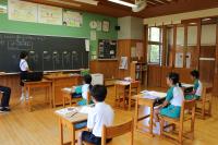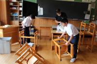 5年 1学期最終日、机や椅子の裏のほこりを掃除します。