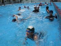 1・2年 体育 1年生は水に浮かんだり潜ったりする練習をしています。2年生はビート板を使って泳ぐ練習です。