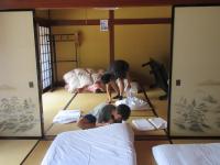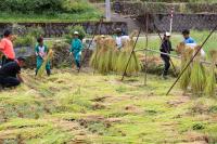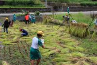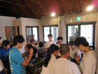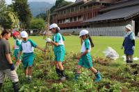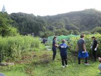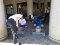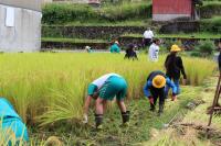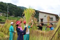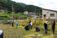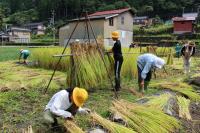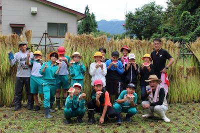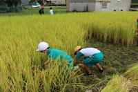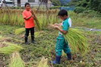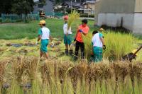5月9日に田植えをした田んぼで、稲刈りをしました。刈った稲は束ねてワラで縛り、稲架がけをします。慣れない作業もだんだんと上手になり、約1時間で終えることができました。暑くて大変でしたが、農家の方のご厚意でスイカをいただき、みんな大喜びでした。