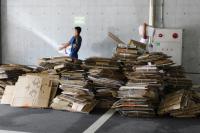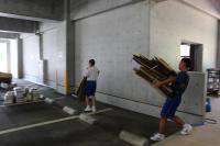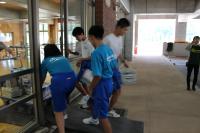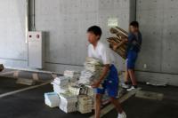 〈中学校〉育友会行事の資源回収に向けて、中学生が学校の古新聞や段ボール、古本などを運び出しました。