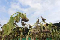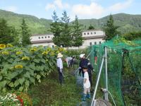 育友会行事の愛校作業、小学生も保護者の皆様といっしょにがんばって除草しました。おかげで、ひまわりの花壇もきれいになりました。ここ数日は種ができてきて、頭を重そうにもたげています。