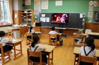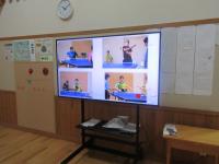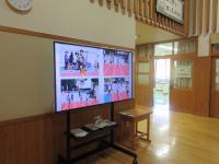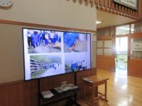 また、中学校棟2階オープンスペースには、大型モニターを配置して生徒たちの日々の活動の様子を紹介しています。