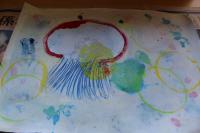 2年 図工「いろいろもよう」 好きな色で泡をつくり、絵に模様を付けています。