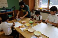 1年 国語 「やくそく」というおはなしの登場人物「あおむし」になりきるための、小道具をつくっています。