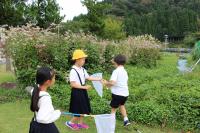 渡りのチョウ、アサギマダラが校庭に咲いているフジバカマの花にやってきています。羽根にマーキングをして再び空へ…「元気でね!」
