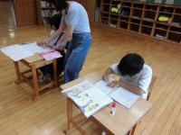 2年生 国語プリントをしています。絵本のリーフレットをつくりました。