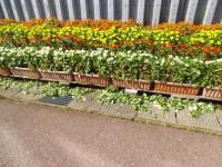 本校の校舎前に並ぶお花が少しずつ成長し、花を咲かせてきました。