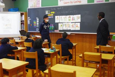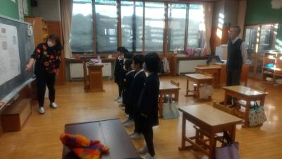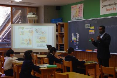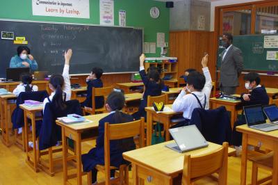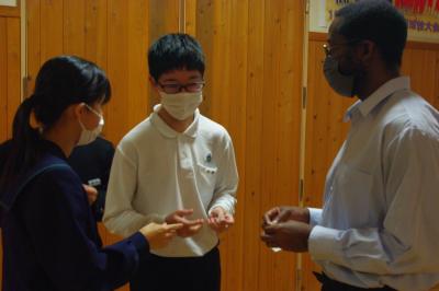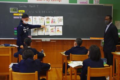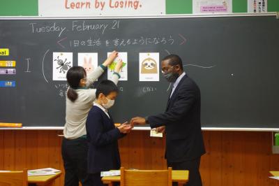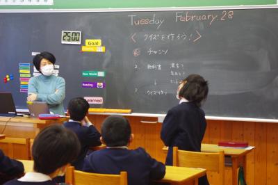 英語 イースターパーティーを行っています。校舎に隠されたタマゴを探し、中に入っている質問をチャールズ先生に行います。後半は、チャールズ先生のクイズに答えています。世界一大きな動物は、A クジラ B ...など。