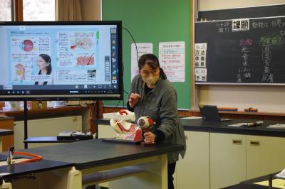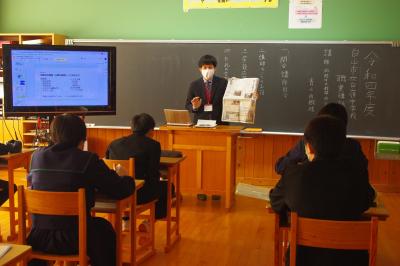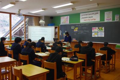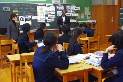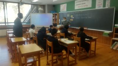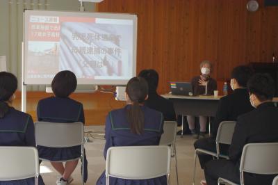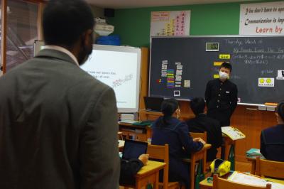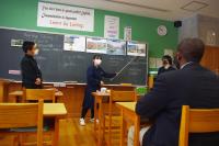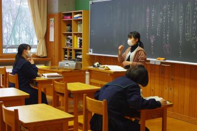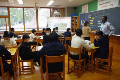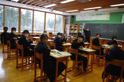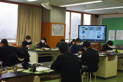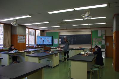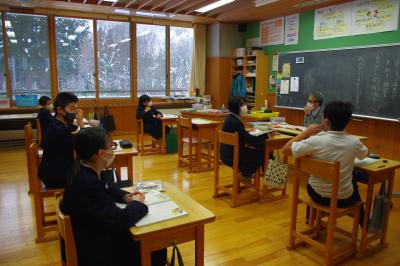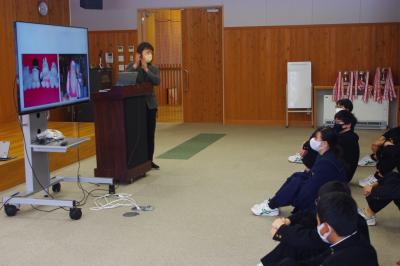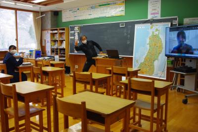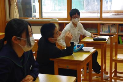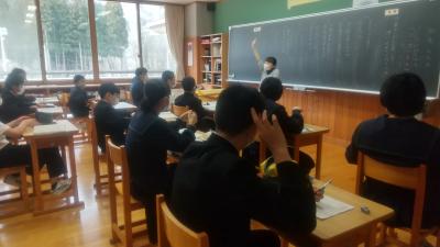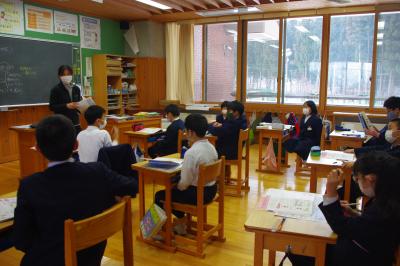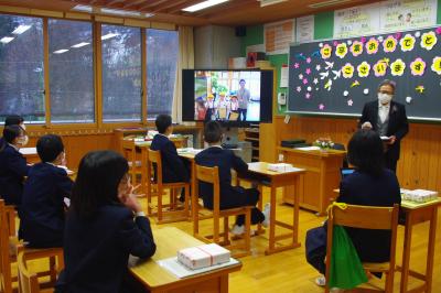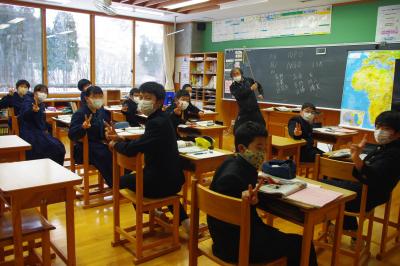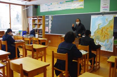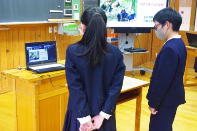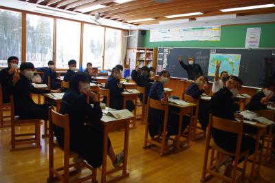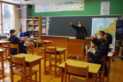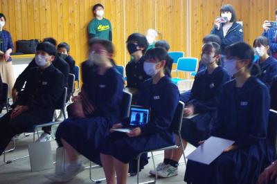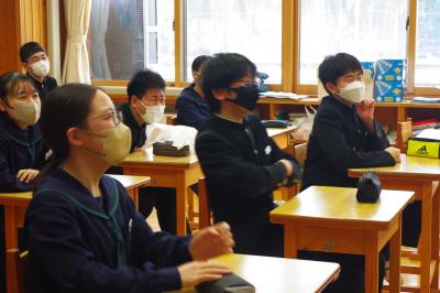 質疑の時間には、今見える雪景色は夏にどうなるのか、今からスキーに行くのでこつを教えてほしい、どんな祭りや特産物や方言があるのか、学校の自慢は何かなどたくさん質問を受けています。本校生徒は学校の自慢として「校長先生が清水先生なこと」と答えています。
