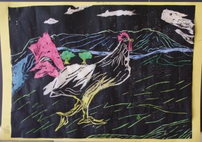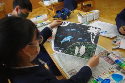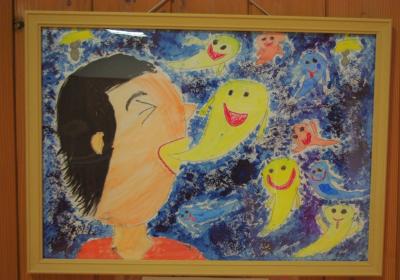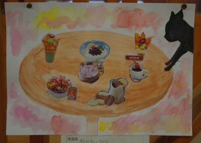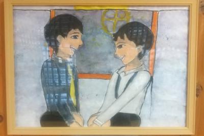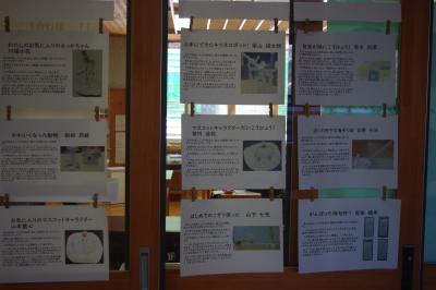 読書感想画を掲示しています。左が小学校2年生、右が小学校5年生の作品です。小学校5年生の作品は、宮沢賢治の銀河鉄道の夜を読んで、登場する二人の少年が旅を通して友情を深める様子を描いています。人物画の書き込みはもちろんですが、背景の空の色をグラデーションにするなど、いろいろと工夫をしています。