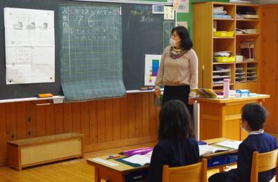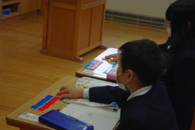 算数 76について、10のかたまりが7つ、1のかたまりが6つと、二桁の数の表し方や考え方を学んでいます。