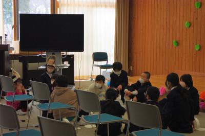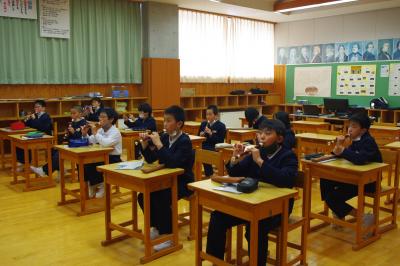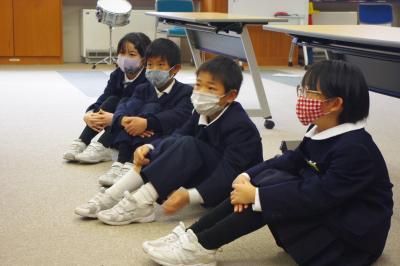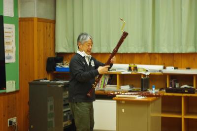 音楽 いろいろな種類のリコーダーの演奏を聴いています。大きな楽器の形や音に興味津々です。